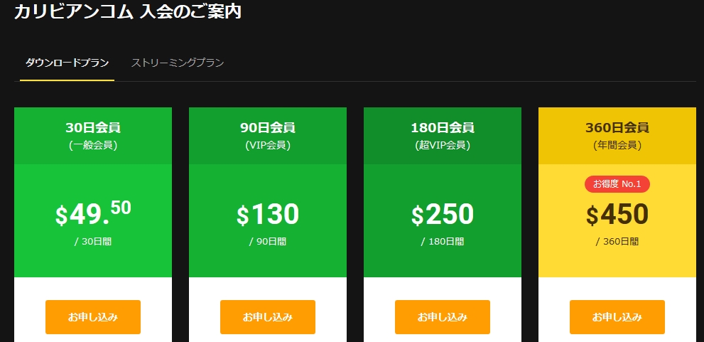 30日会員(一般会員) 90日会員(VIP会員) 180日会員(超VIP会員) 360日会員(年間会員)の4プランが用意されている。